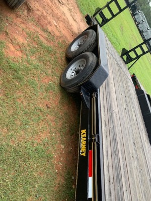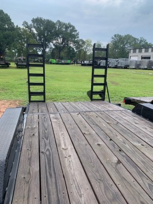 RAVEN BLACK;4' DOVE TAIL FLOOR ON HEAVY DU TY EQUIPMENT HAULERS;CAT YELLOW PIN STRIPES;5' CH FOLD UP RAMPS ILO 5' CH SLIDE IN RAMPS;KICKER FEET ON CHANNEL FOLD UP RAMPS;SPARE MOUNT ON FRONT CENTER OF TRAILER ON HEAVY DUTIES