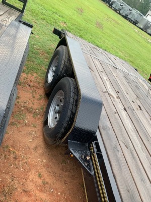 RAVEN BLACK;4' DOVE TAIL FLOOR ON HEAVY DU TY EQUIPMENT HAULERS;CAT YELLOW PIN STRIPES;SPARE MOUNT ON FRONT CENTER OF TRAILER ON HEAVY DUTIES